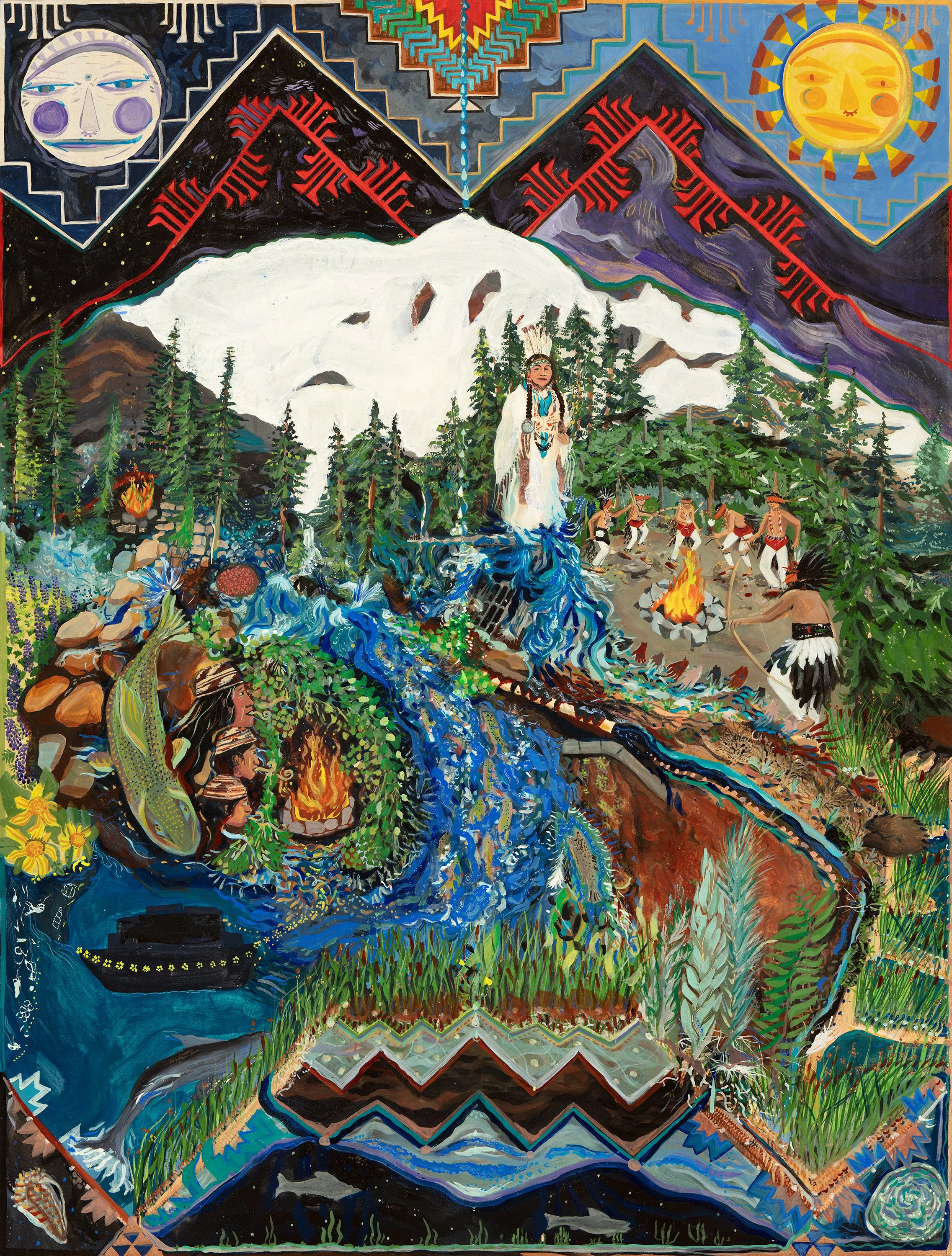 Salmon Home: Waterways Repair and Winnemem Wintu Cosmology of Care is a painted story-map in collaboration with Michael “Pom” Preston, Chief Caleen Sisk’s son and Nichella Garcia, tribal educator.